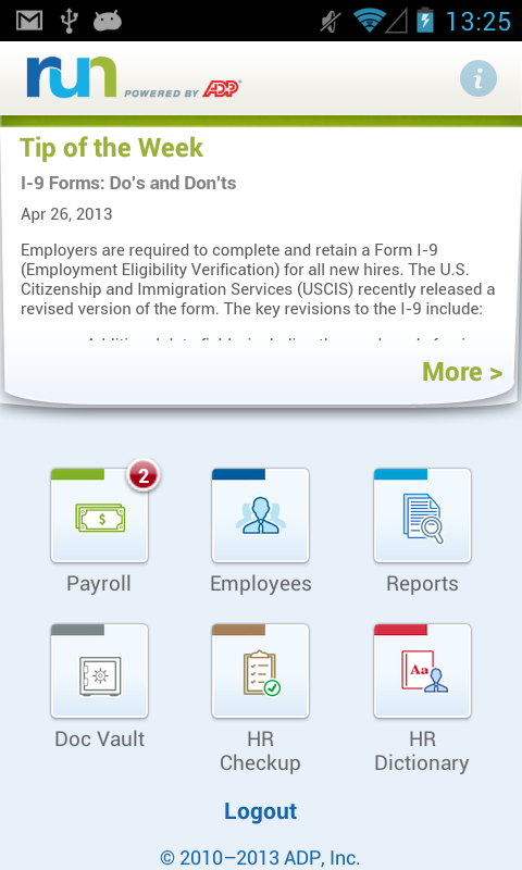 Final payroll run. • View pre-built reports for insights into payroll results. •make payment elections from a unified self-service application that Get automatic tax updates through a cloud-delivery model. • Provide system-to-system integration ... Retrieve Doc